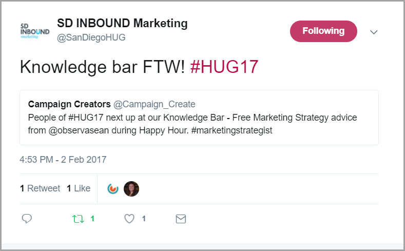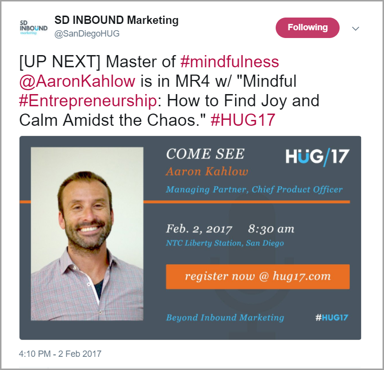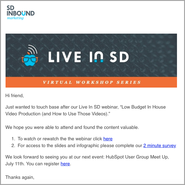 Again, segmented content and outreach to qualified leads regardless of attendance is recommended. Keep in mind the background goal of “completing the cycle;” as important as it is to generate interest in your product/service, there is also great value in ensuring simply that your attendees come to the next event you host. For example, after each Inbound Education seminar we co-host with SD Inbound, we send a follow up email the next day recapping the event, providing the presentation slides, and a link to sign up for the next event.